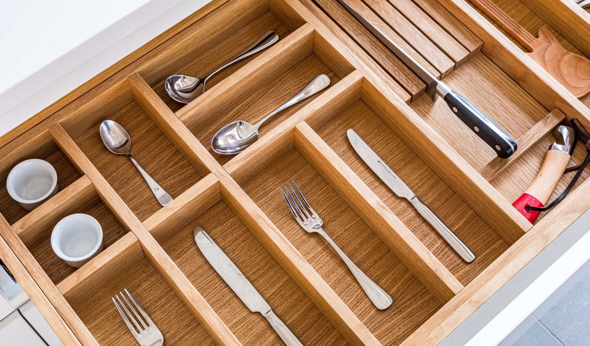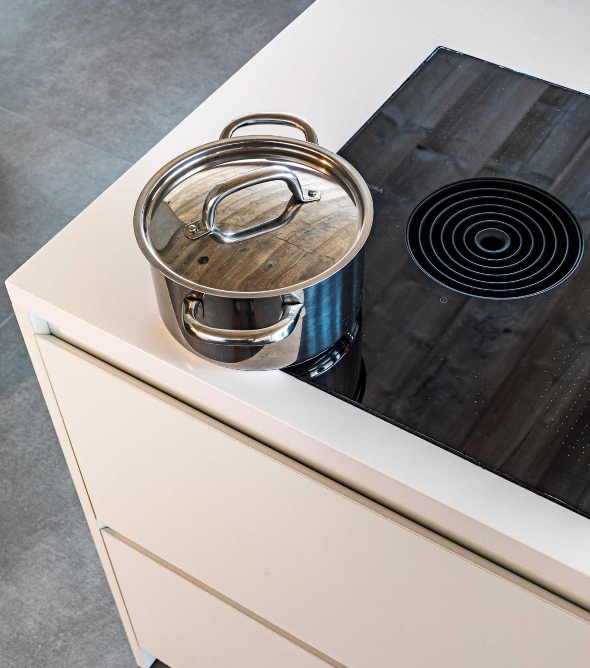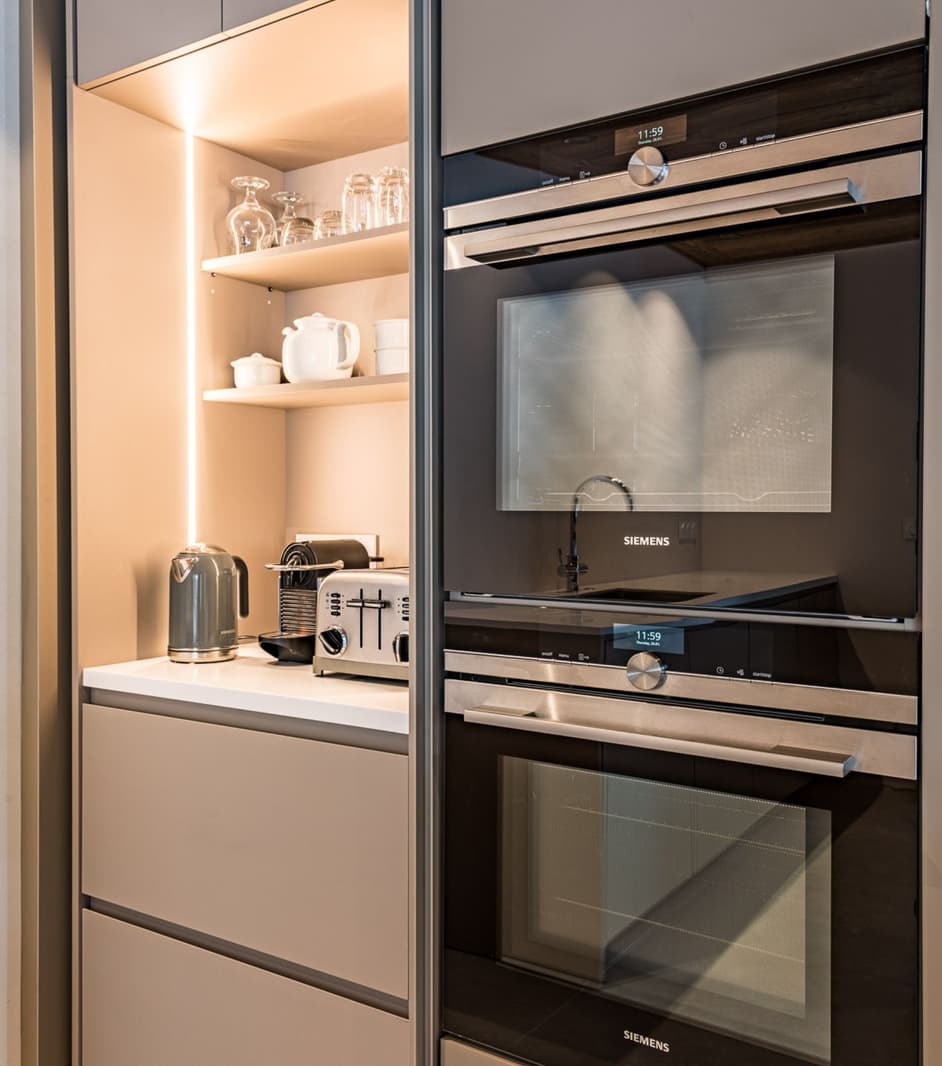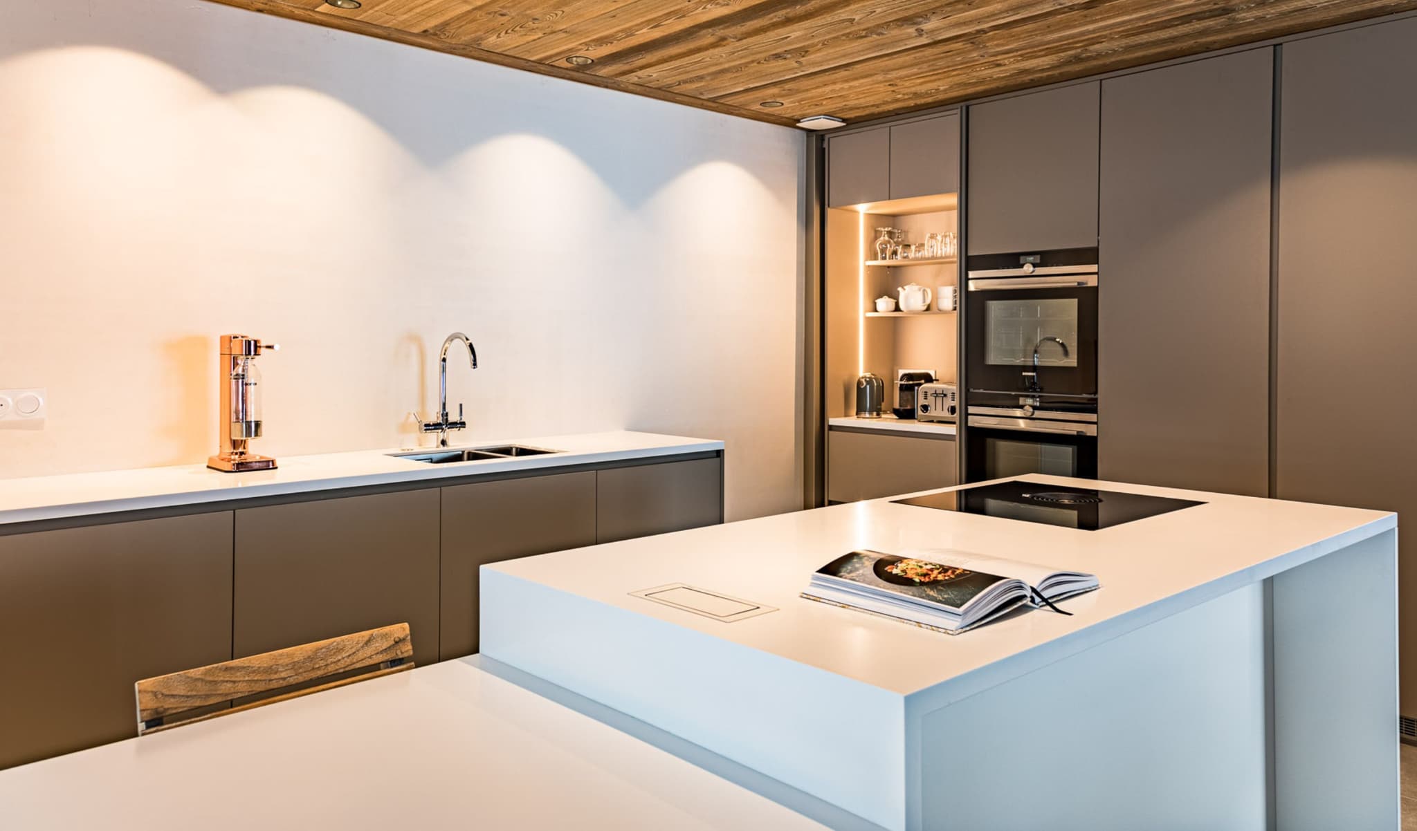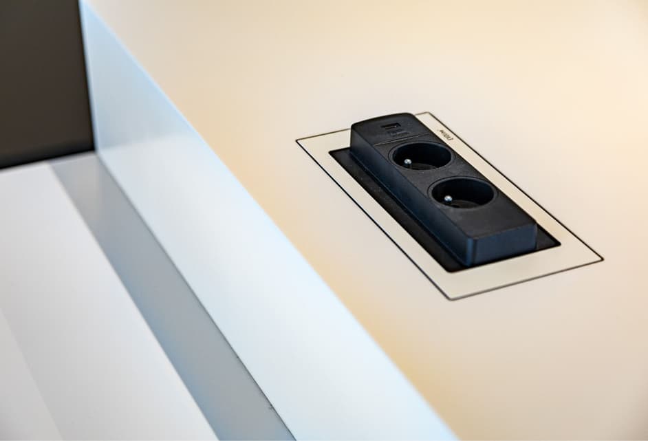 Construits en Corian, nous avons conçu une île flottante et une table minimalistes. Dans le plan de travail, nous avons monté un Evoline Backflip pour les appareils électriques et le chargement.