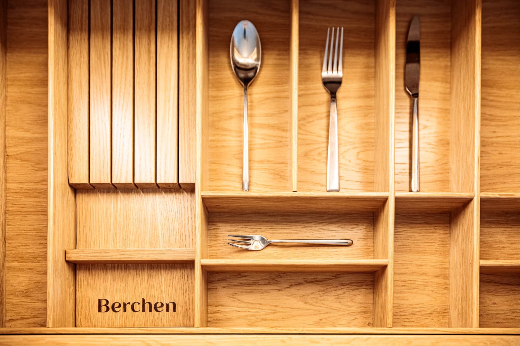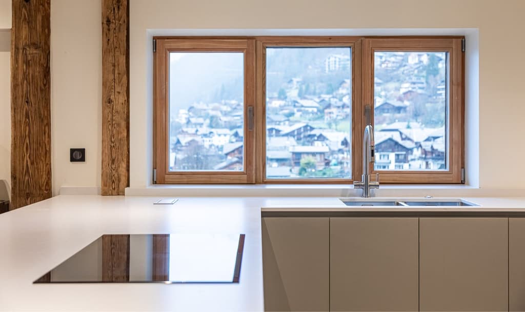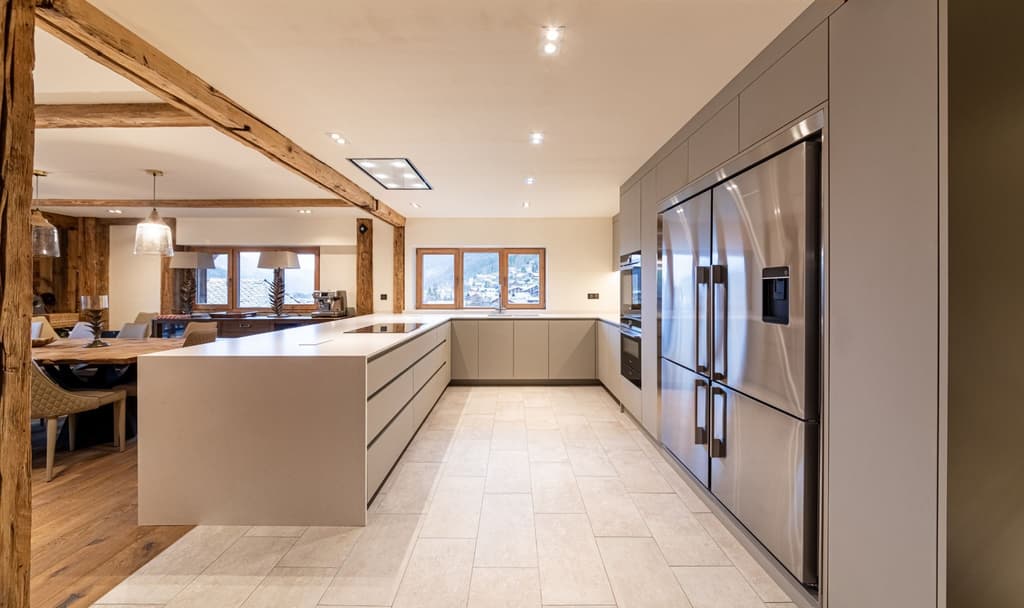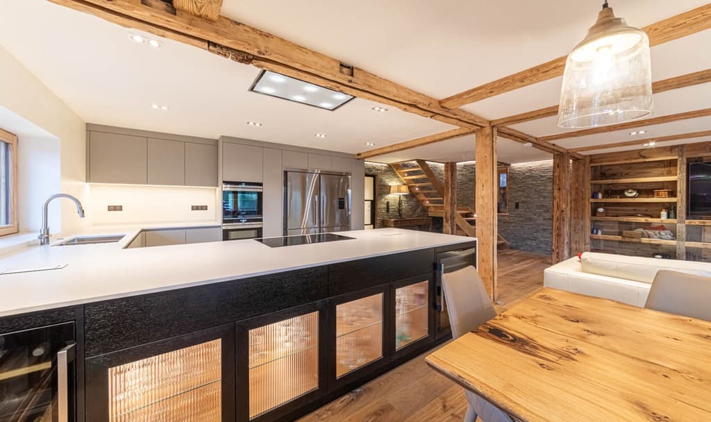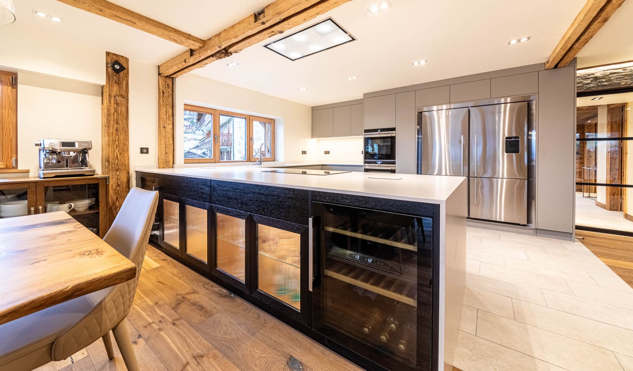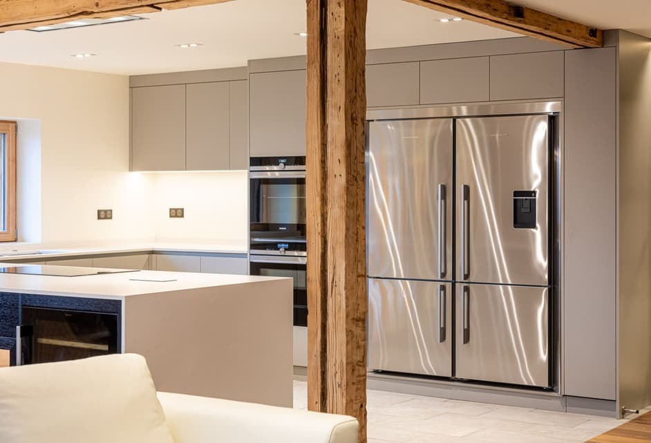 Nous avons choisi Forbo Pebble pour les façades des armoires, qui combinent une surface mate satinée avec une texture chaleureuse et fine qui donne un aspect et une sensation vraiment distinctifs et individuels. Pour le meuble à boissons et de service, nous avons utilisé du placage en chêne que nous avons teinté en noir satiné avec des portes en verre cannelé. À chaque extrémité, nous avons placé des caves à vin intégrées. Tous les tiroirs sont en chêne massif avec des joints en queue d'aronde.