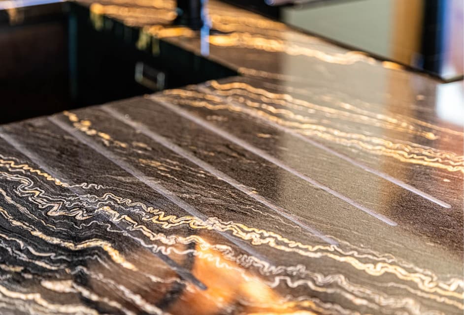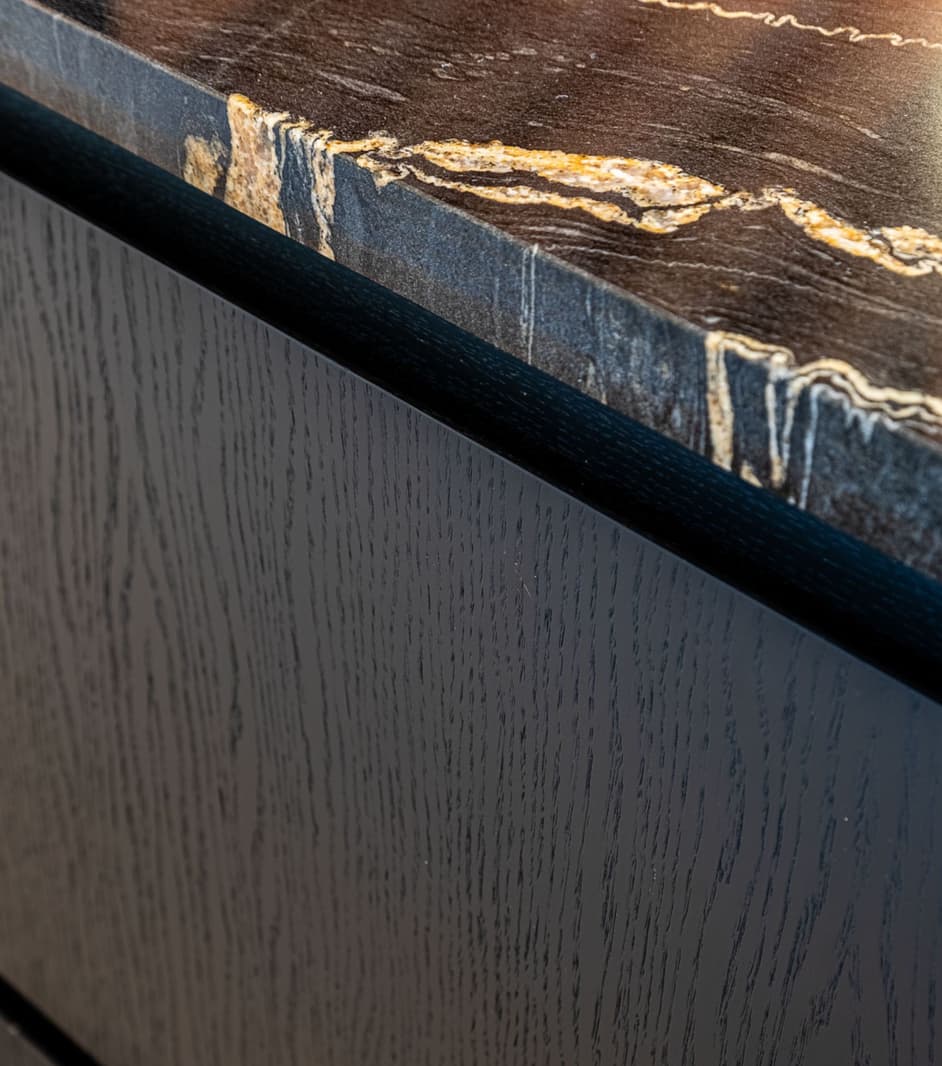 Pour le plan de travail, le client a opté pour African Storm. C'est à la fois une surface pratique et une œuvre d'art qui fait tourner toutes les têtes qui entrent dans la pièce.