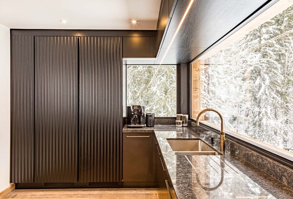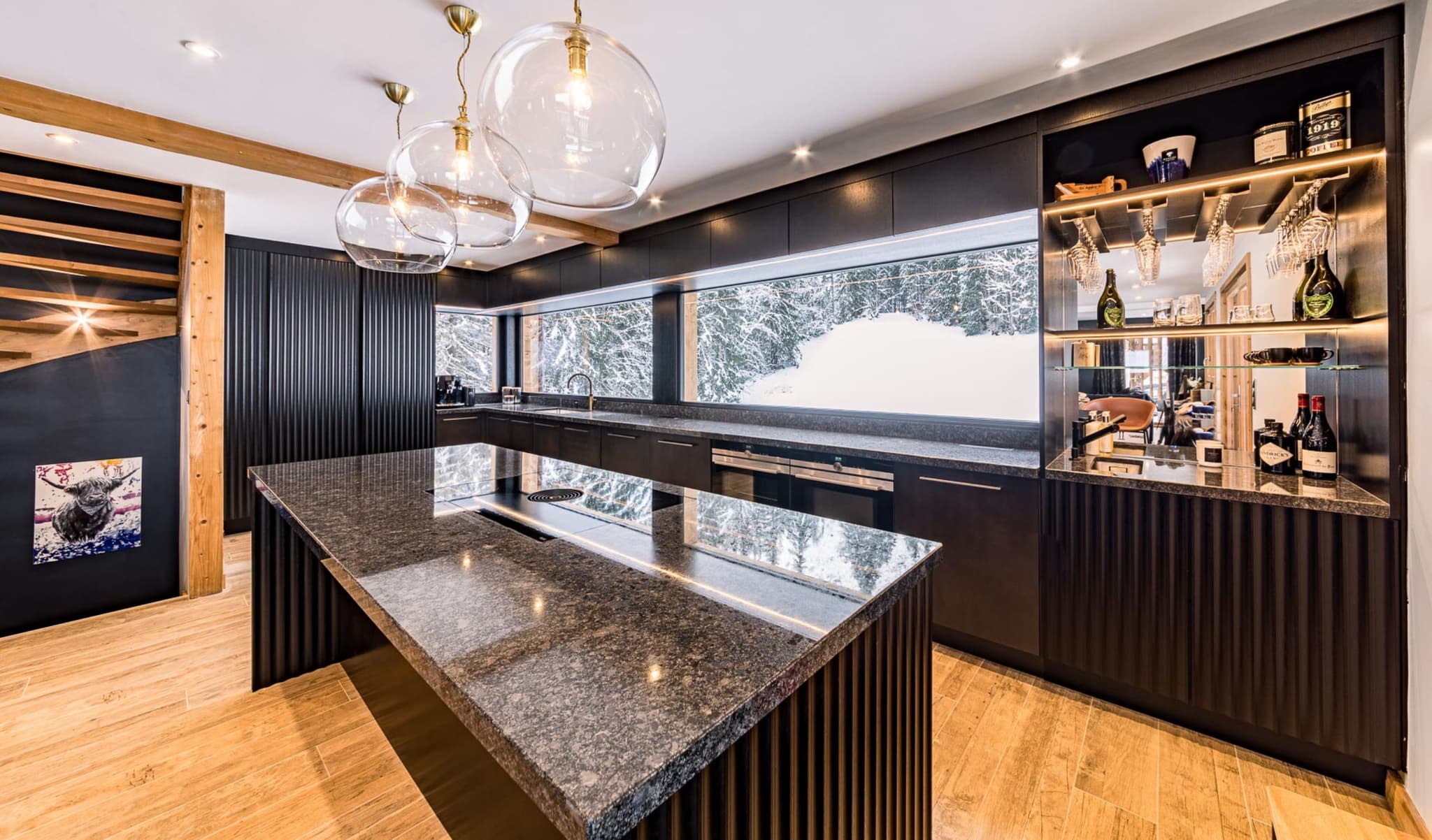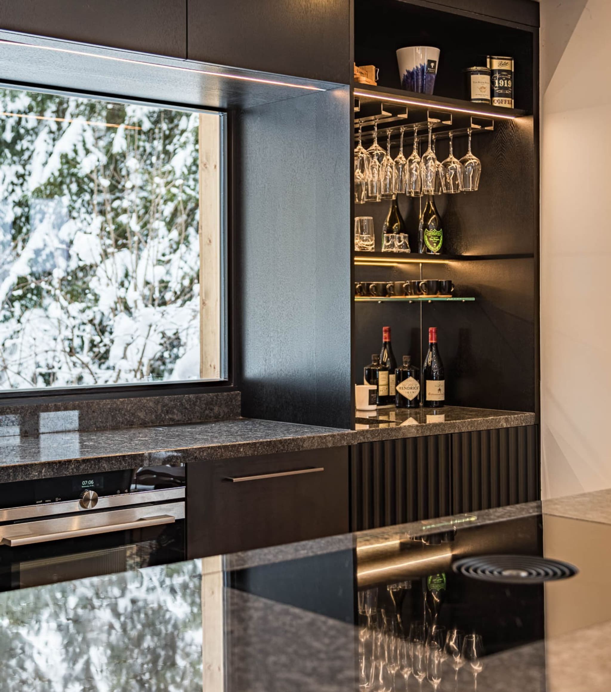 La vue depuis le côté droit du chalet est imprenable et, au coucher du soleil, elle crée une teinte rose impressionnante sur les falaises de l'Ardoisière. Ainsi, nous avons proposé de créer une immense crédence de fenêtre encadrée par la cuisine. Le résultat... image parfaite.