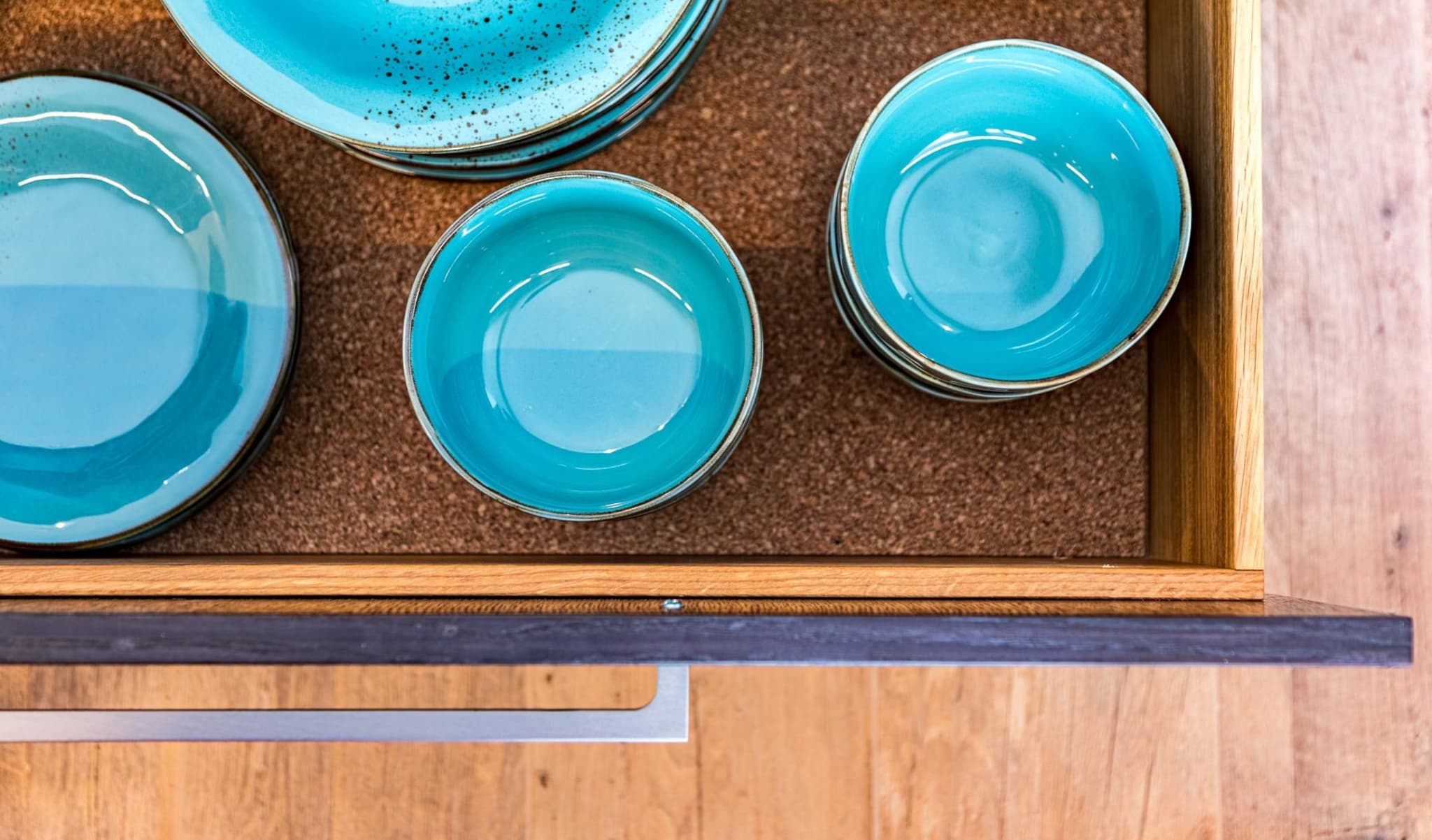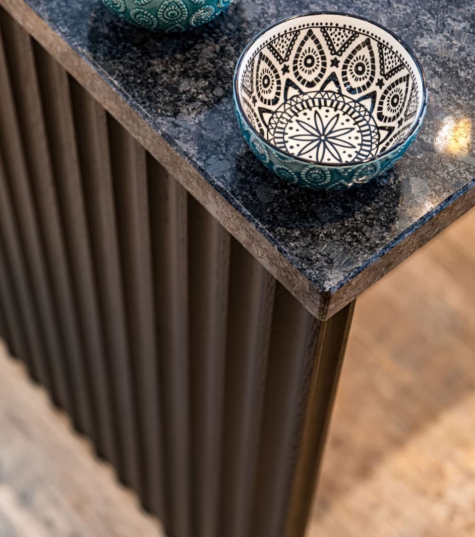 Nous avons usiné de grandes rainures sur le chêne qui donnent de la profondeur et de la texture à l'îlot, au bar et aux armoires hautes. Nous l'avons associé à des portes en laiton dépolies individuellement à l'acide et à un plan de travail naturel Scaleo Steel Grey. Une cuisine totalement unique pour cette superbe rénovation. Tous les tiroirs sont en chêne massif avec des joints en queue d'aronde.