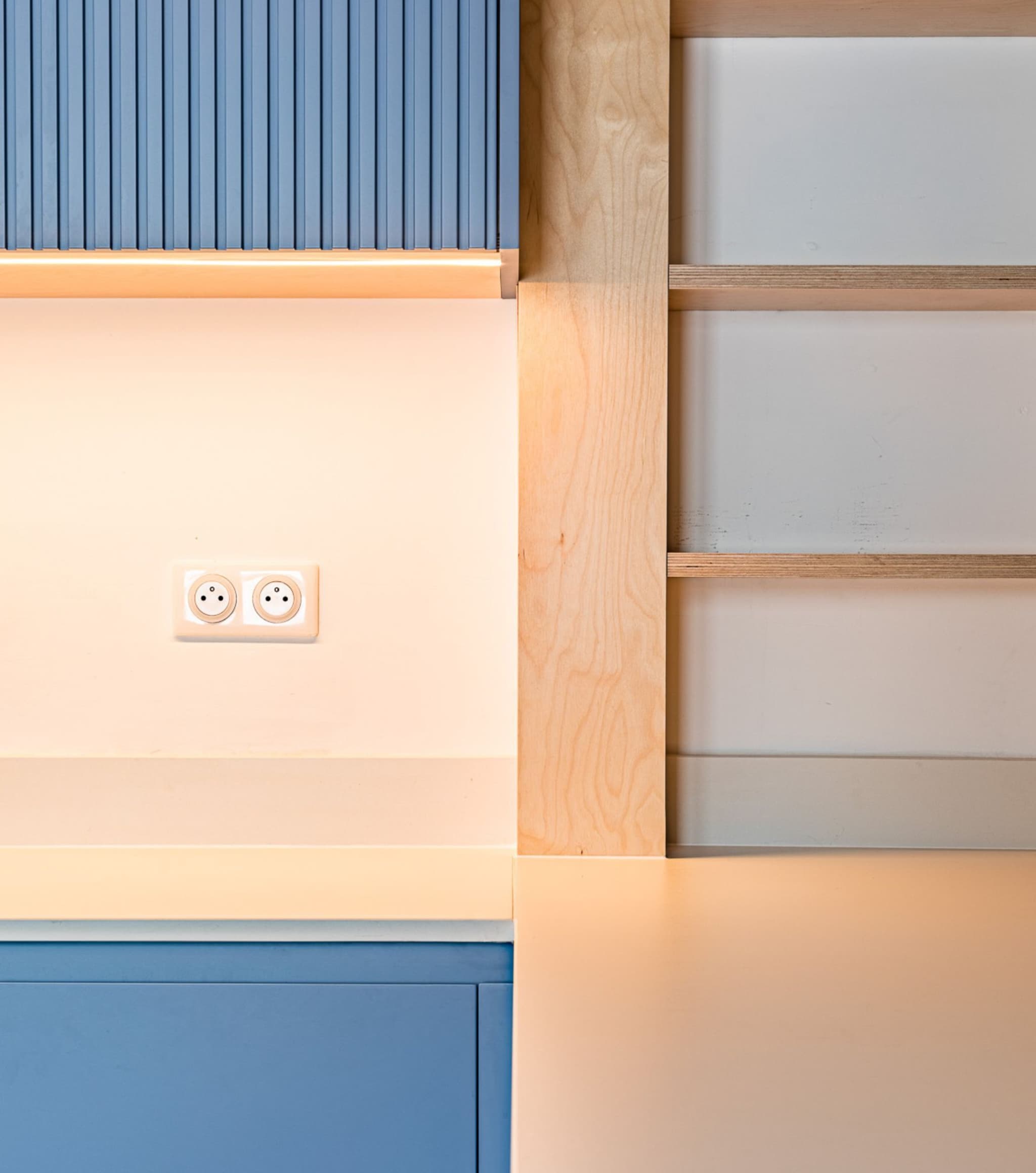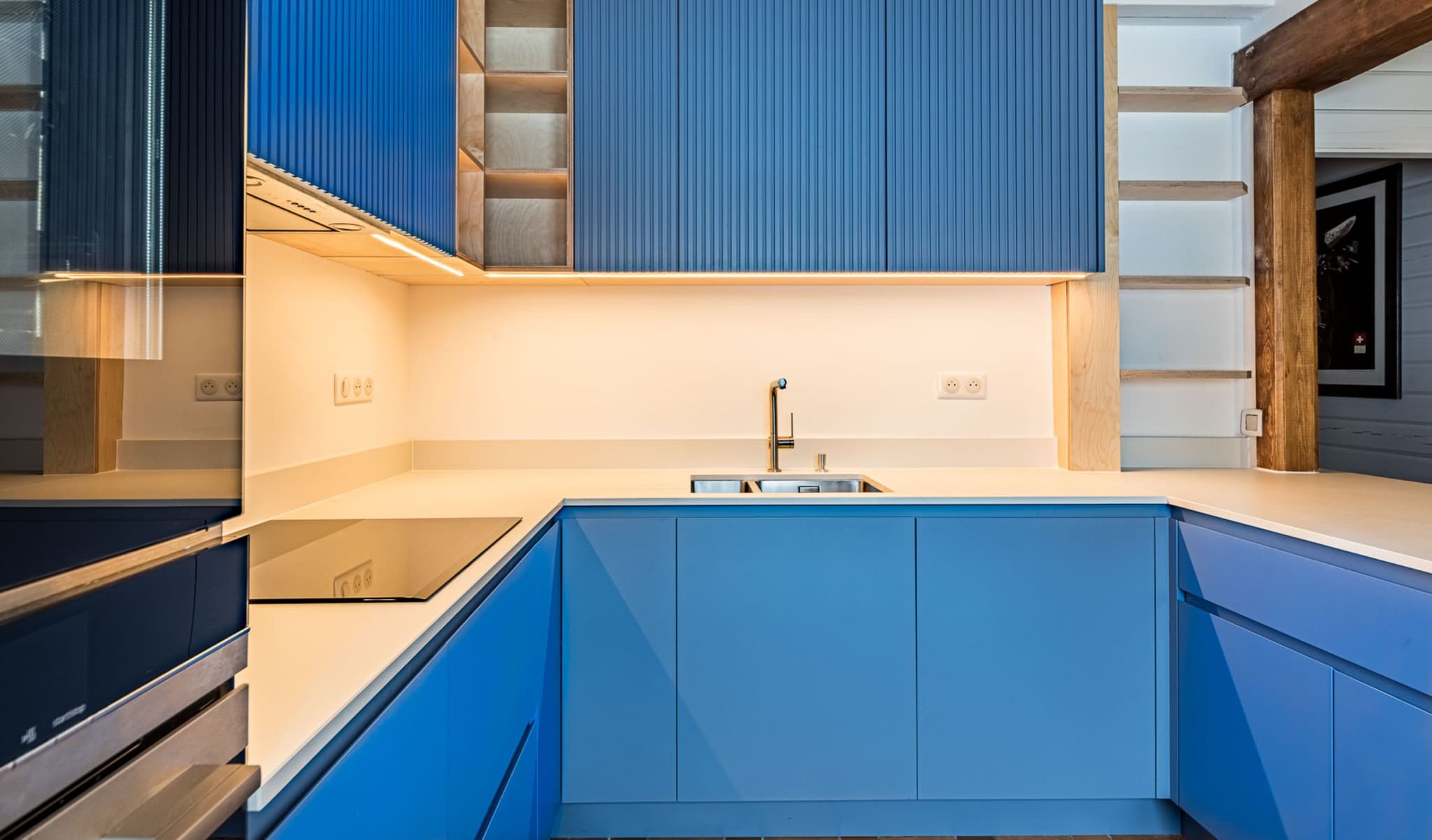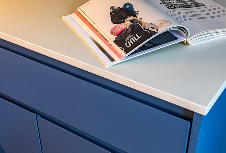 Satin Pidgeon Blue se combine parfaitement avec la finition mate Dekton Zenith.