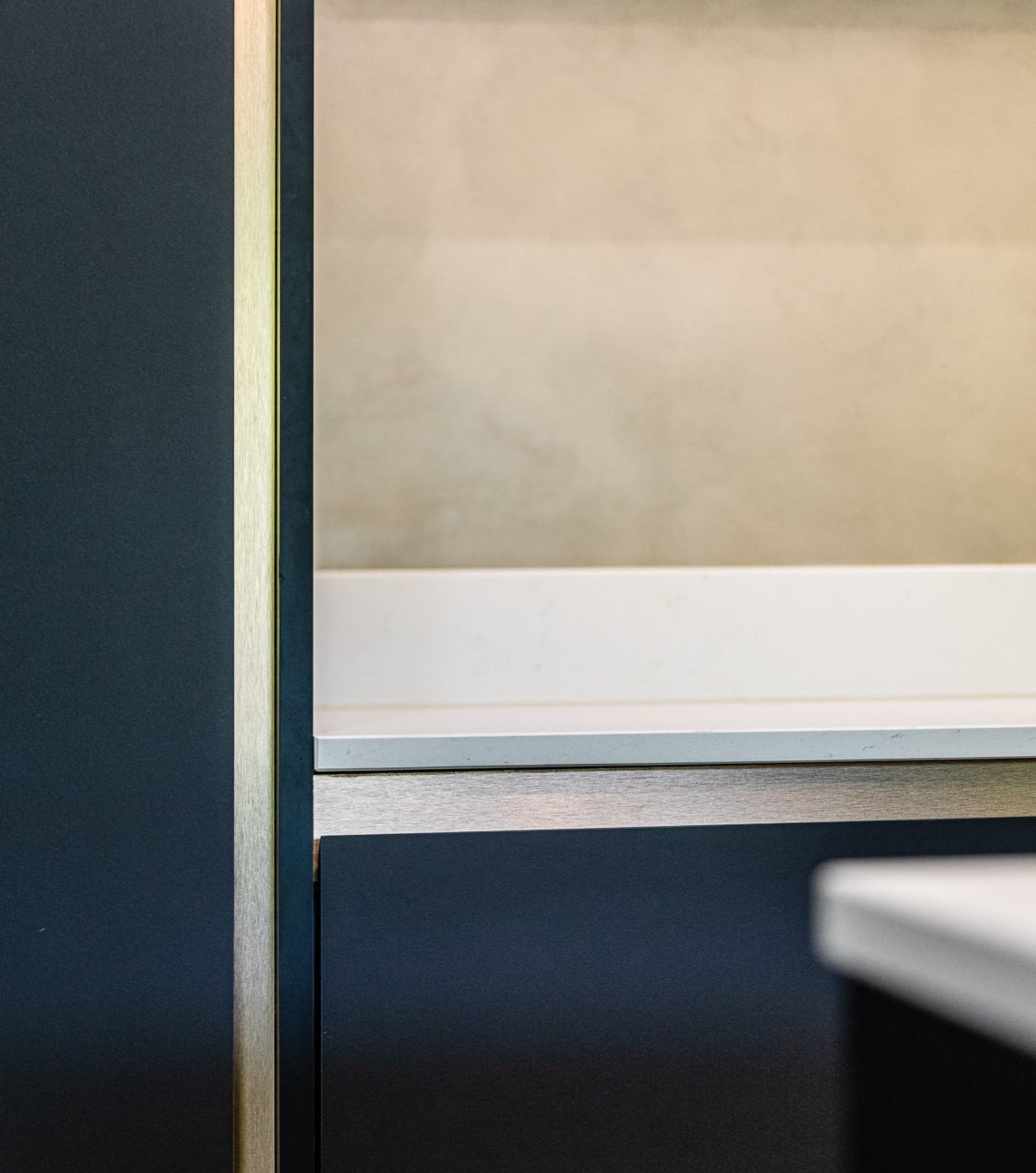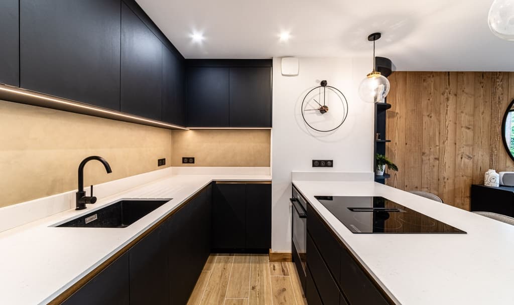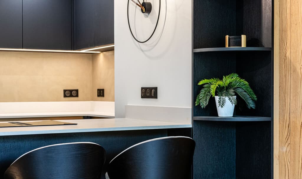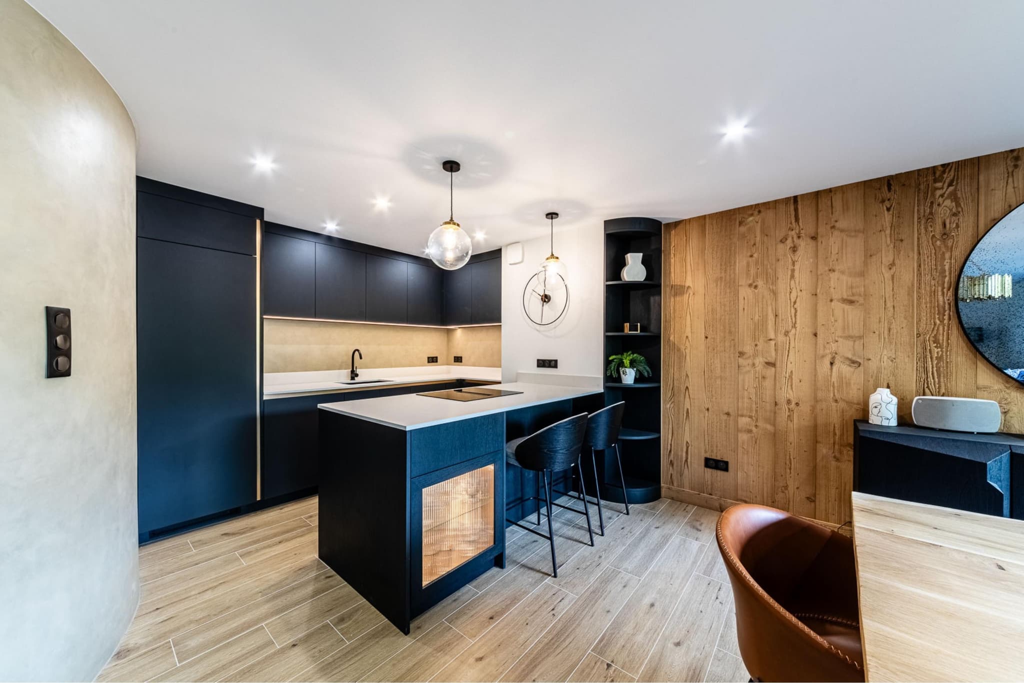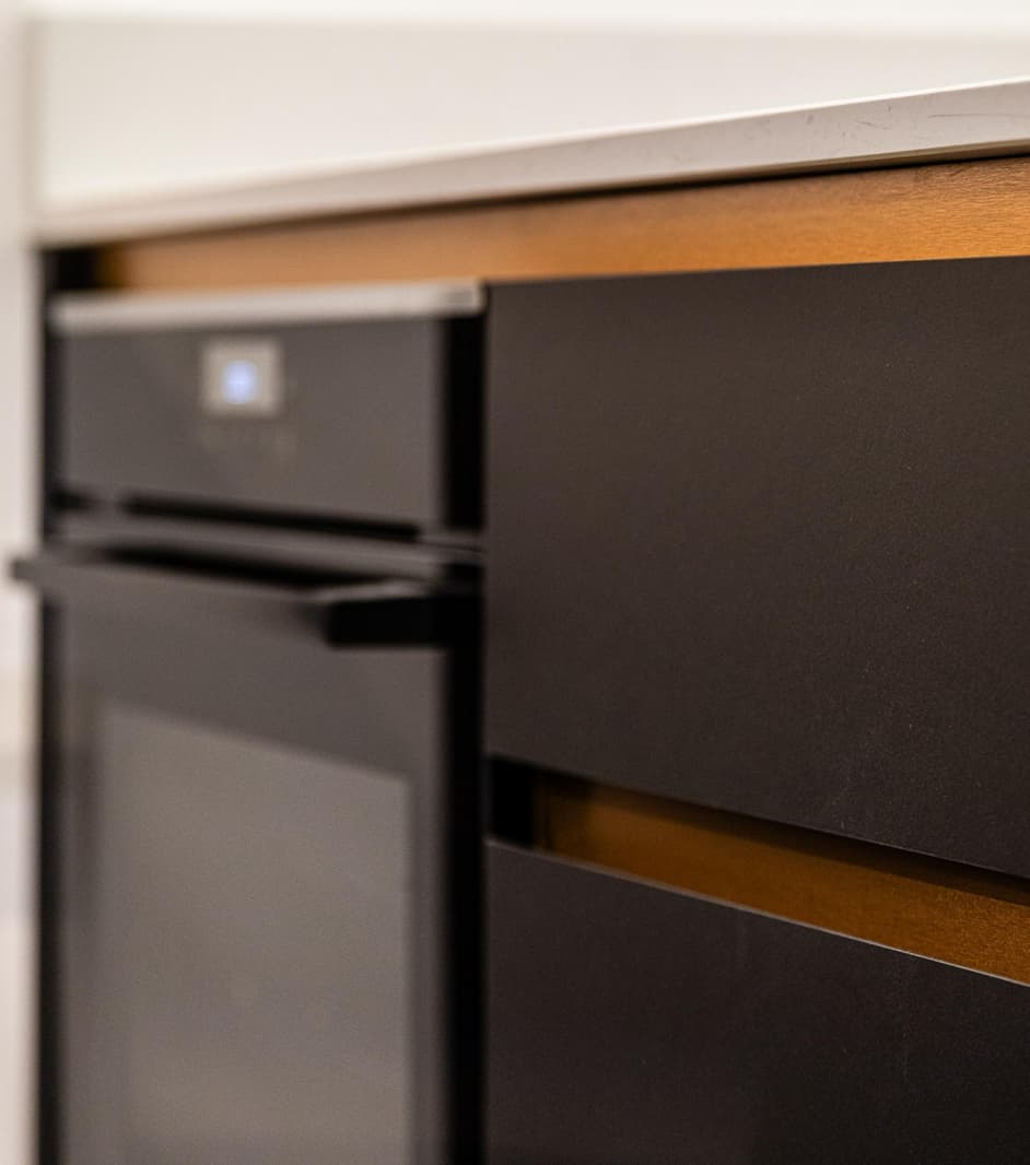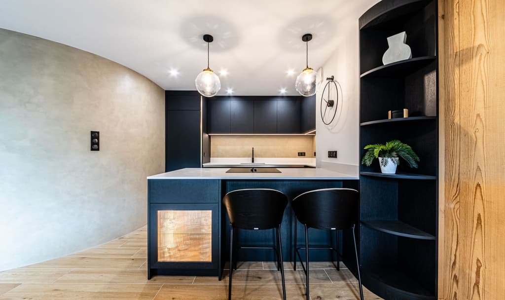 Une autre rénovation exceptionnelle réalisée par RS Interior Design, à laquelle nous avons été ravis de participer. Inspirés par le mur incurvé, nous avons fait écho à sa forme avec les étagères décoratives du sol au plafond. Pour les façades de la cuisine, nous avons utilisé du charbon de bois Forbo, un matériau qui allie une finition mate à une texture douce et chaleureuse pour un aspect et une sensation vraiment uniques. Les poignées cachées ont été fabriquées en Homapal SRM dans un ton bronze brossé, ajoutant une touche subtile mais raffinée. Face à la salle à manger, nous sommes passés au placage de chêne brossé et teinté, créant un meuble à boissons élégant et rétroéclairé pour compléter l'espace.
