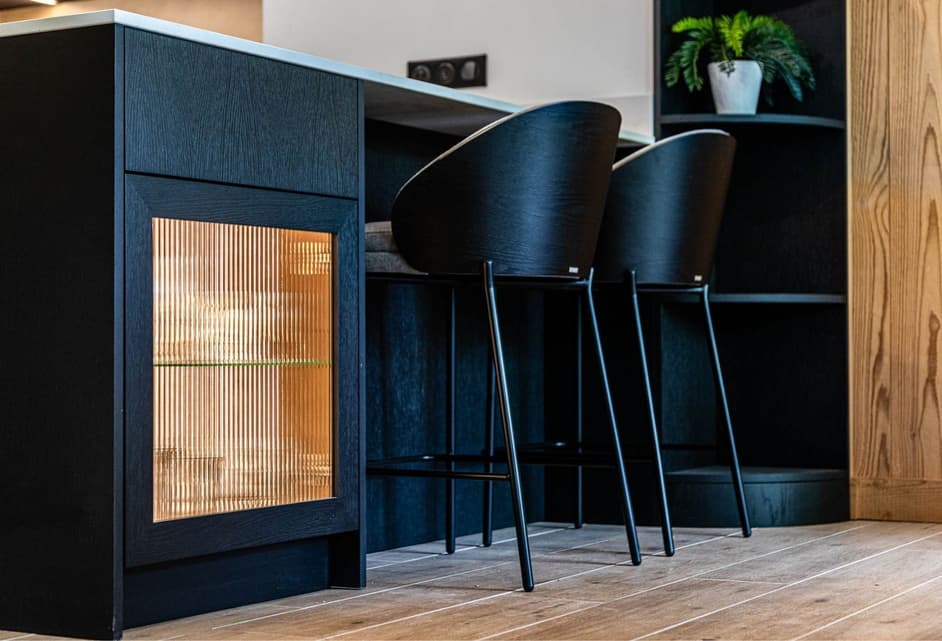 Une armoire à boissons en verre cannelé encadrée de chêne brossé, alliant texture et élégance pour un look moderne et saisissant.